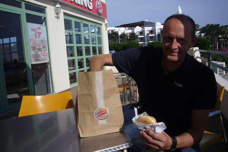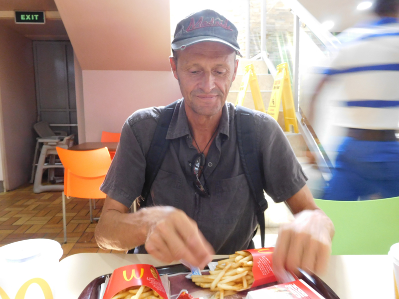 Im ‚Restaurant‘ selber ist er dann so gierig auf seinen Burger, dass er kaum Zeit für ein Lächeln hat. Voll konzentriert und unter dem total Verlust von Humor beim Fotografieren, fängt er an seine Pommes in sich hinein zu schaufeln.