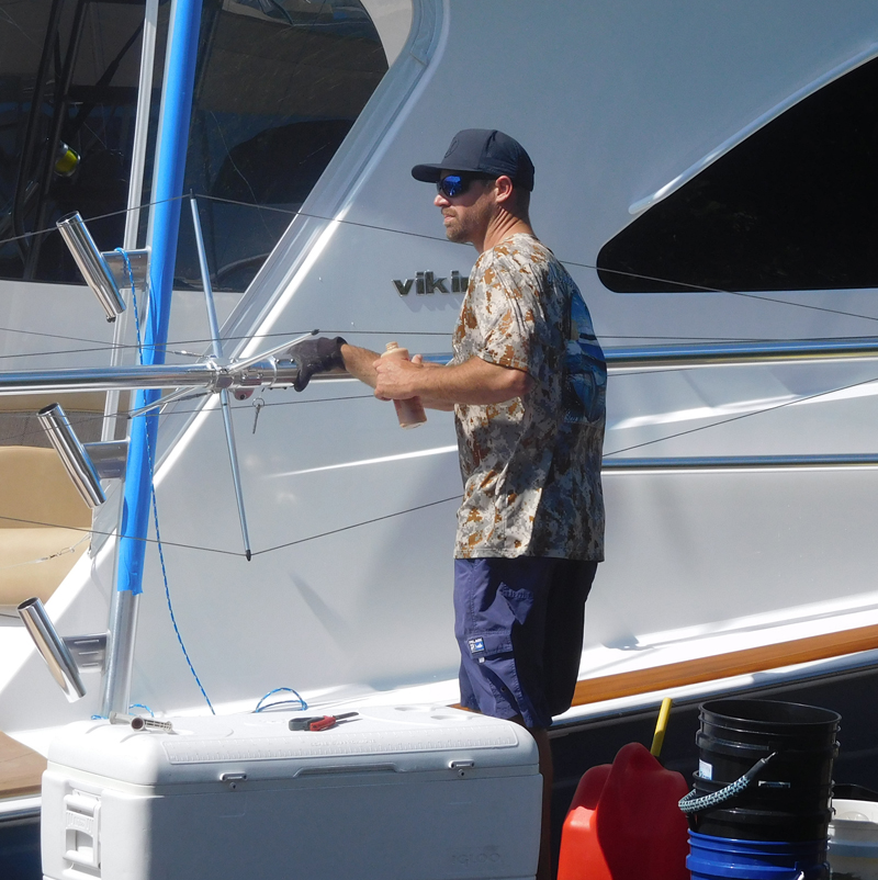 Jede freie Minute wird geschrubbt, abgespritzt, poliert, gefeudelt und gewischt. Bereits beim Festmachen läuft schon einer der Jungs mit einem Schlauch über Deck.
