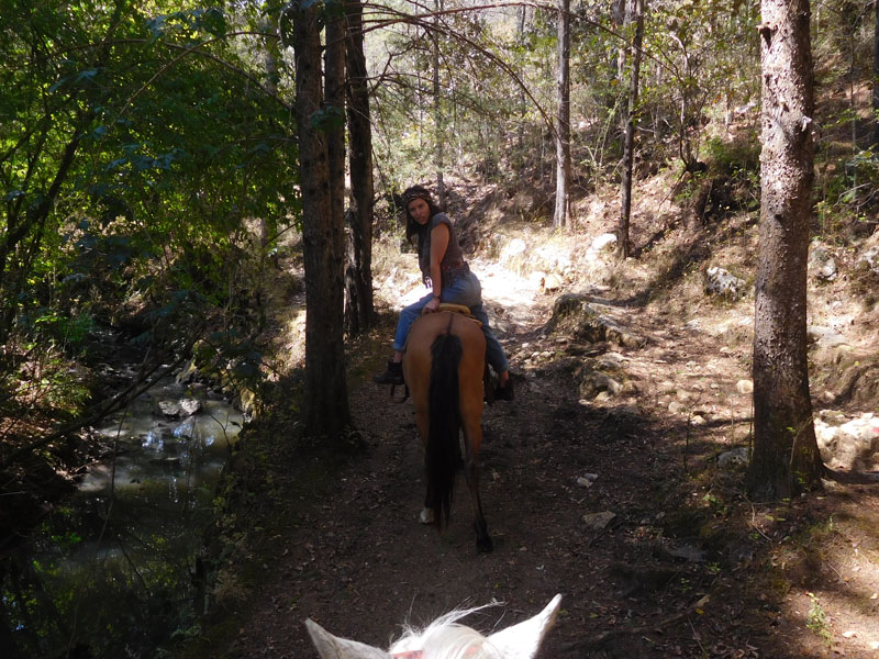 Ein Stück durch den Wald hilft uns beiden beim Abkühlen. An einem Bach will Palomo trinken. Boa, der Gaul ist ein Querulant, keins der anderen Tiere hat Durst. Alle Augen auf mich, wie ich verzweifelt versuche den Gaul vom Bach weg zu bewegen.