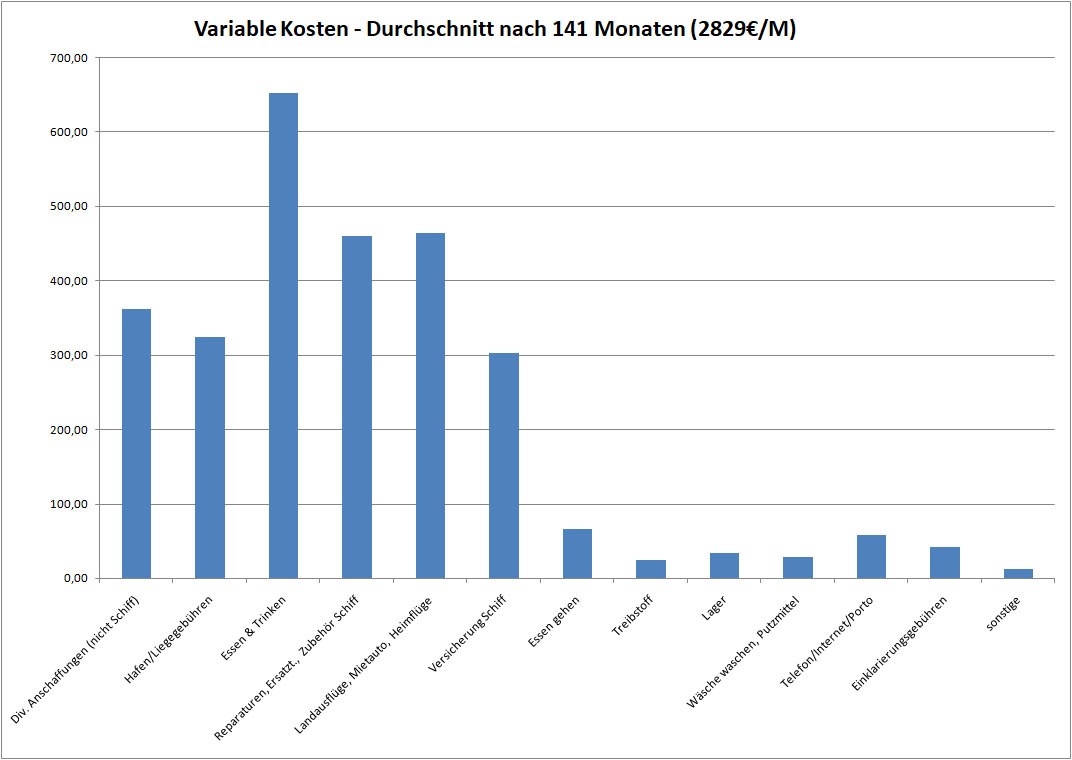 Bevor wir zu unserer Langfahrt aufgebrochen sind, haben wir uns das auch gefragt und wenige Antworten gefunden. Daher haben wir uns entschlossen, unsere Ausgaben monatlich zu veröffentlichen. Dies mag den Blauwasserseglern helfen, die ebenfalls eine Weltumseglung oder Langfahrt planen.